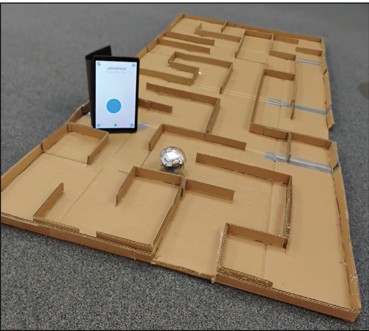 A maze made from cardboard. On top of it is a tablet with the Sphero app open and a Sphero robot.