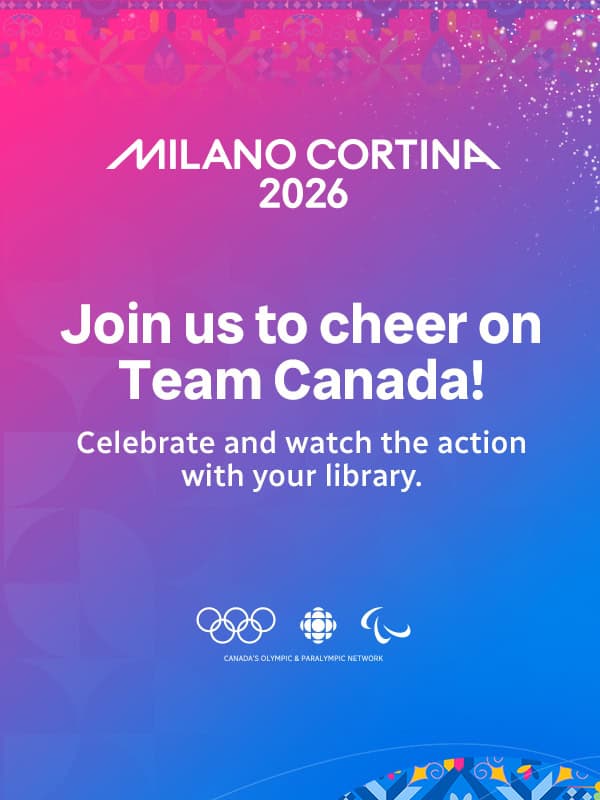 Background is pink, purple, and blue. Text says "Milano Cortina 2026. Join us to cheer on Team Canada! Celebrate and watch the action with your library."