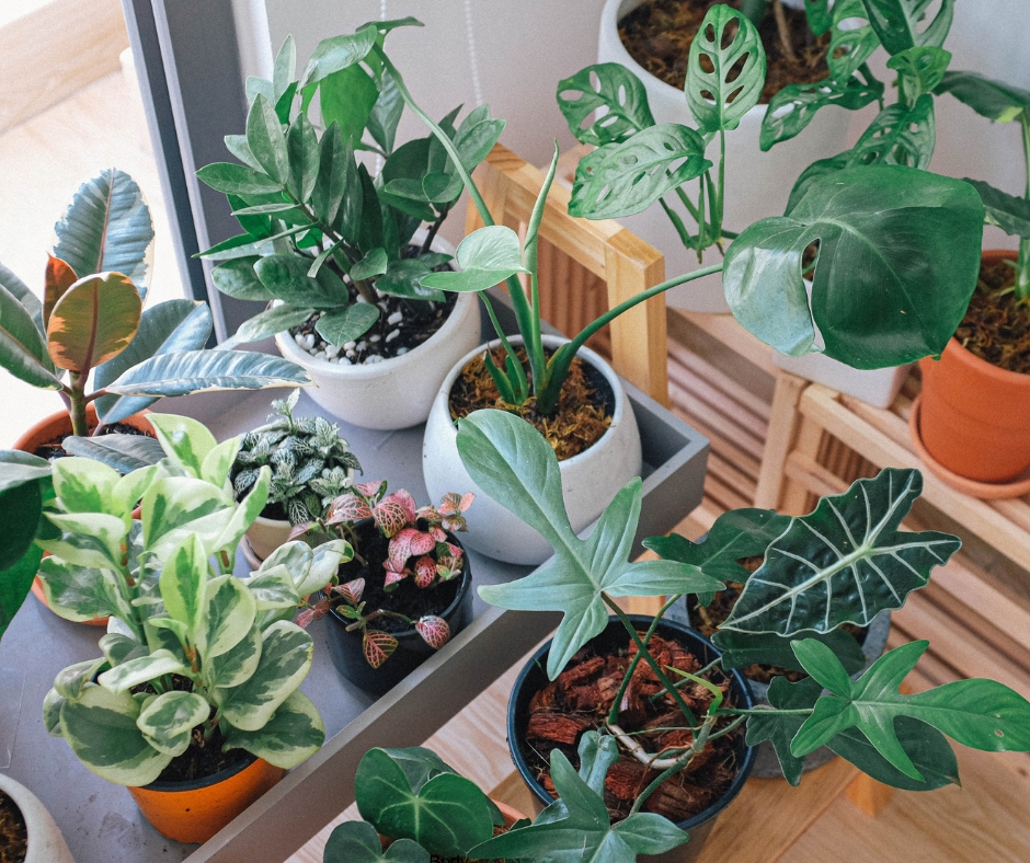 A variety of different kinds of houseplants in pots of different size and colour. They are assembled on different stands and tables.