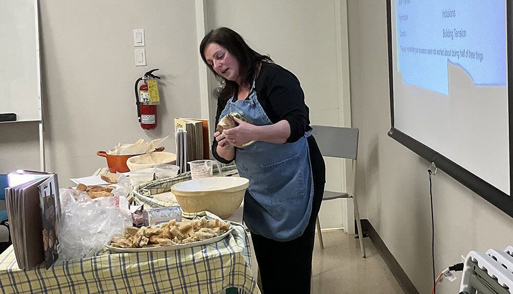 image of a woman standing by a table in front of a screen wearing an apron and holding bread in her hands.