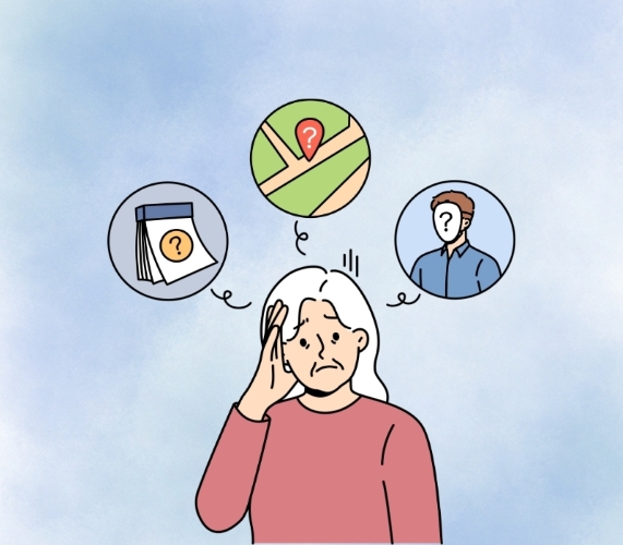 A cartoon of an old woman who looks confused. Above her head are thought bubbles with a calendar date, a map, and a person. They all have question marks to signify she's unsure what and who they are.